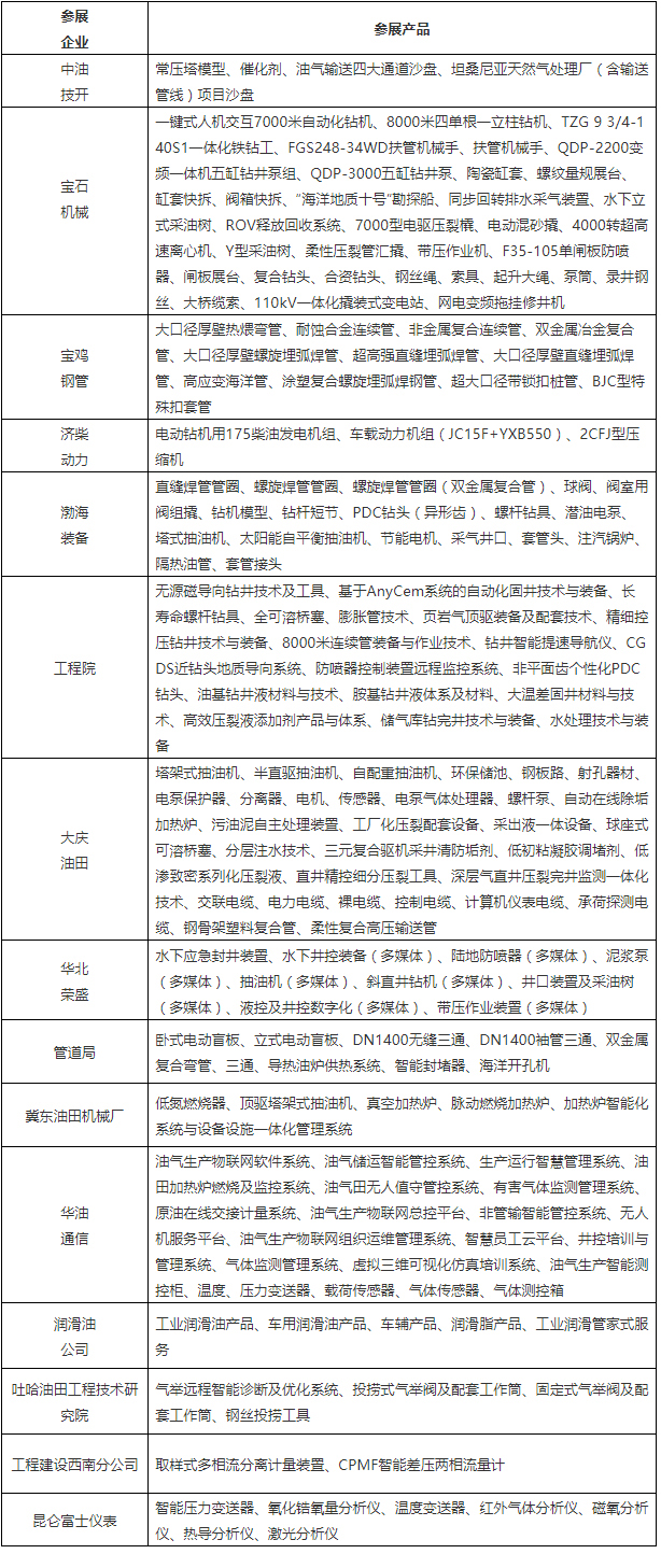 本屆展會,中國石油裝備展團(tuán)重點(diǎn)展示產(chǎn)品與服務(wù)業(yè)務(wù)如下: