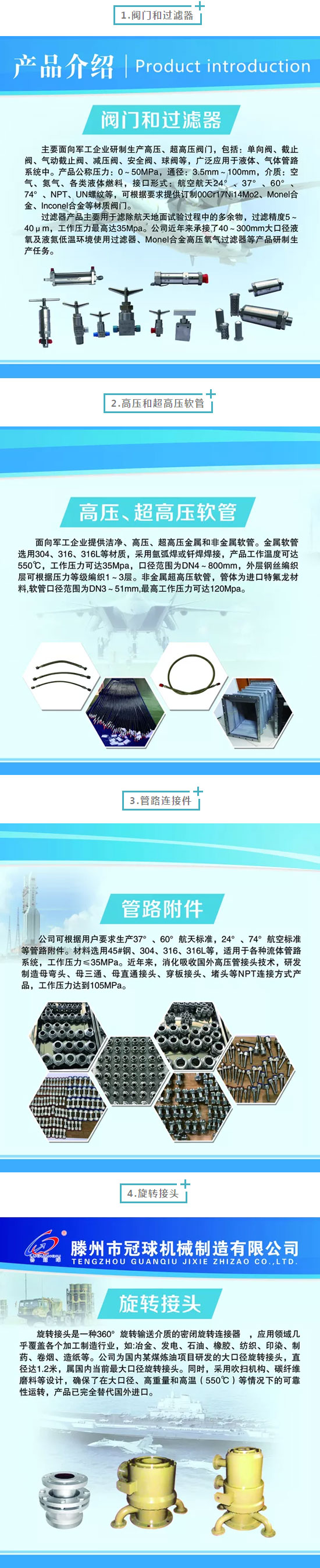 目前,公司研究開(kāi)發(fā)出高壓金屬軟管、超高壓金屬軟管、真空金屬軟管、高壓超高壓閥門和過(guò)濾器等多款產(chǎn)品,已廣泛應(yīng)用于航天、航空、造紙、鋼鐵、石化等行業(yè)。