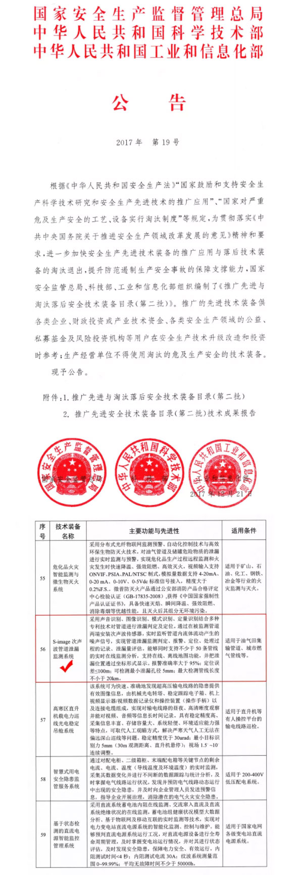 2017年12月,S-image次聲波管道泄漏監(jiān)測系統(tǒng)列入由國家安全監(jiān)管總局、科技部、工業(yè)和信息化部組織編制的《推廣先進(jìn)安全技術(shù)裝備目錄2017》, “S-image次聲波管道泄漏監(jiān)測系統(tǒng)” 列入目錄第56項(xiàng),是國家重點(diǎn)推廣,具有顯著的技術(shù)先進(jìn)性,實(shí)踐證明使用有效的安全技術(shù)裝備。