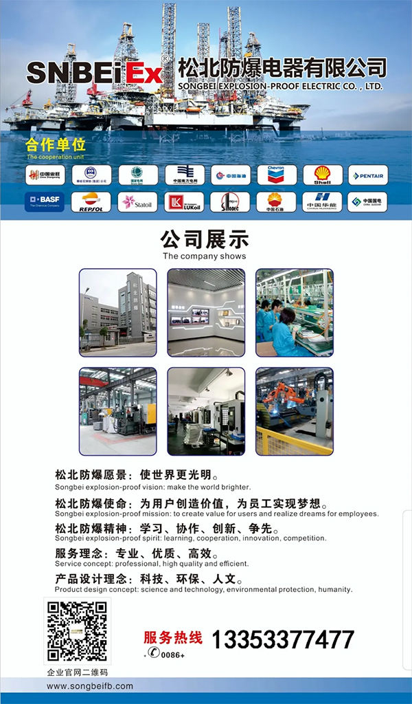 松北防爆電器有限公司是一家及研發(fā)、制造、銷售一條龍的專業(yè)性企業(yè)。公司產(chǎn)品廣泛應用于石油、化工、天然氣、煤炭、 航空航天、船舶、海洋、軍工、消防、電力、鐵路、冶金等行業(yè),國內(nèi)暢銷31個省市和10多個國家和地區(qū),深受廣大用戶好評和贊美 。公司主要生產(chǎn):防爆燈、防爆配電箱、防爆操作柱、防爆控制箱、防爆磁力啟動器、防爆開關(斷路器)、防爆插銷、防爆按鈕、 防爆軟管、防爆填料函、防爆電纜盤、防爆接線盒及管件、防爆其它類、防爆配件等100多種產(chǎn)品。